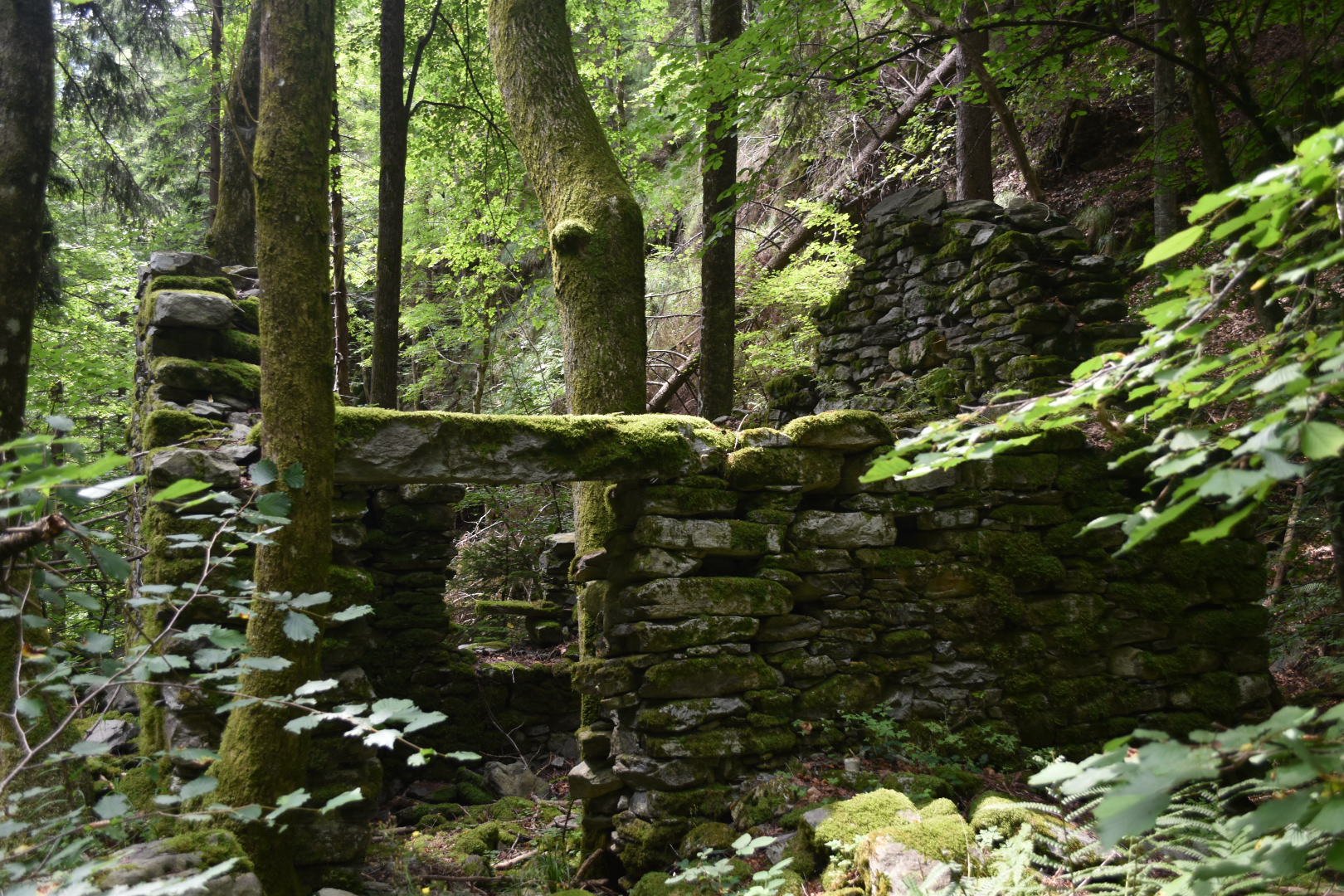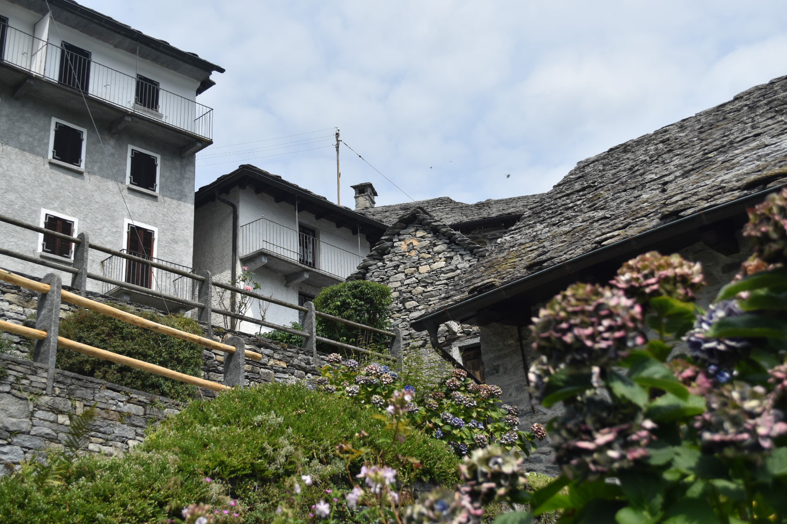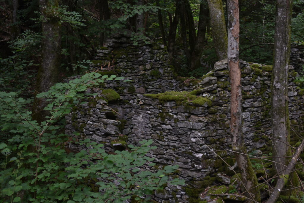 we walked towards the small village Lionza just a few hundred meters above. Our goal was to reach Pizzo Ruscada, but we got a little lost on the mountain and ended up walking a much longer route than necessary. For your information, and in my defence, the routes can be quite hard to identify in some places. We reached Lionza and had to walk a little bit through small villages before heading out in the mountain forest again. The Swiss Italian alpes have lots of rustic huts, granite huts, which are an magnificent sight for people who have interest in architecture or construction work. The huts are build almost purely out of granite stone from the surrounding mountains and wood strong enough to carry the weight. Back in the days, these rustic huts were inhabited by farmers, but today they are mostly used for vacation.