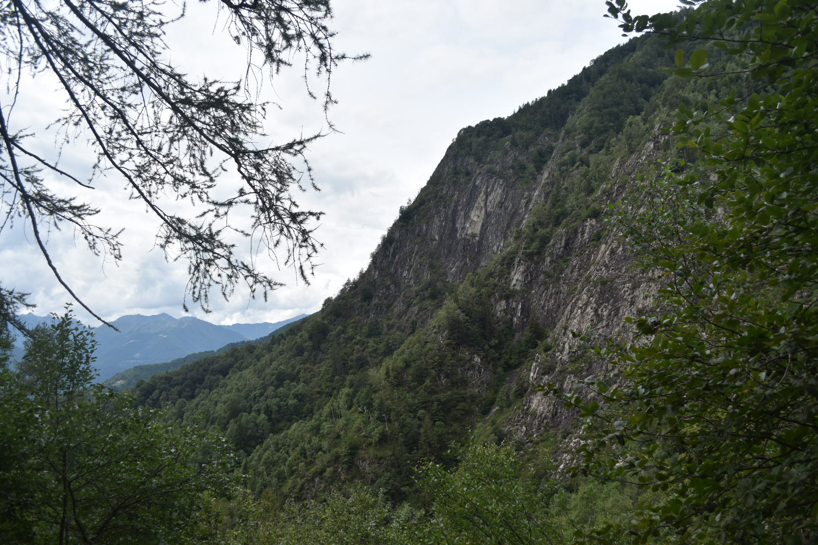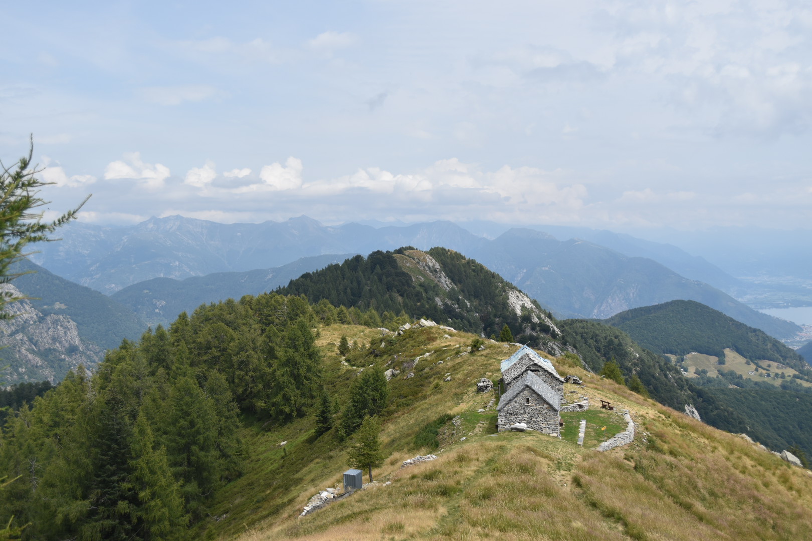 A bit further up we started to be surrounded by the cliffs. Here we were walking on a landslide of stones. Ceazar was jumping around as if he was a mountain goat, while we were struggling a bit more. But every time we would stop to catch our breath, we also got time to appreciate the beautiful landscape. A few hundreds meters after, we reached Rifugio Corte Nuovo. Looking North from here you see a lot of Swiss Italian mountains yet to be explored. Looking East you can see all the way to Lake Maggiore and Locarno. And to your West you see Pizzo Ruscada laughing at you, teasing you to continue the hike. We stayed here for a while enjoyed the view before walking down again. This time we took the faster, more direct trail, leading almost straight down to the village Lionza.